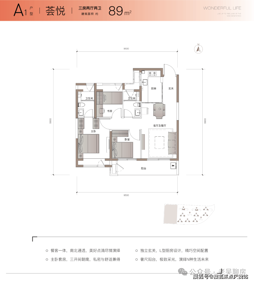 三开间朝南布局,拥有近10米的南向面宽,确保两个卧室与客厅均能沐浴充沛阳光,实现最优通风与采光。约6.3米宽阔阳台延伸了室内外的视觉与生活场景,既可眺望园景,也可作为休闲、种植与社交的灵活空间;双卫配置科学分离使用功能,早晚高峰时段洗漱与沐浴互不干扰,有效化解家庭生活的“时间冲突”,让日常节奏更显从容。在有限的面积中,实现功能、尺度与体验的全面突破,这正是天和产品研发的深厚功力所在,也是赢得众多置业者青睐的关键价值。